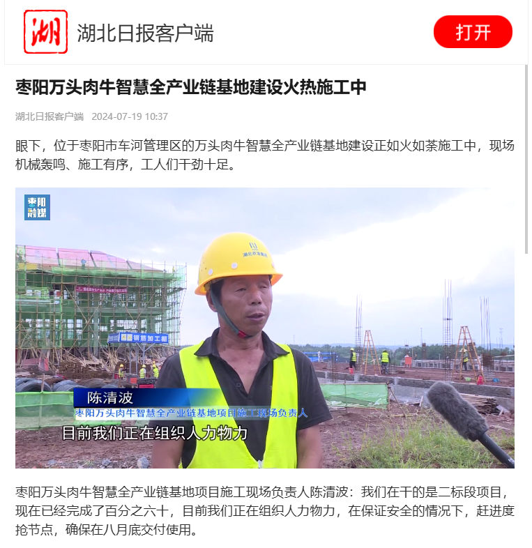 湖北日報(bào):棗陽萬頭肉牛智慧全產(chǎn)業(yè)鏈基地建設(shè)火熱施工中